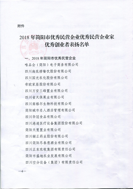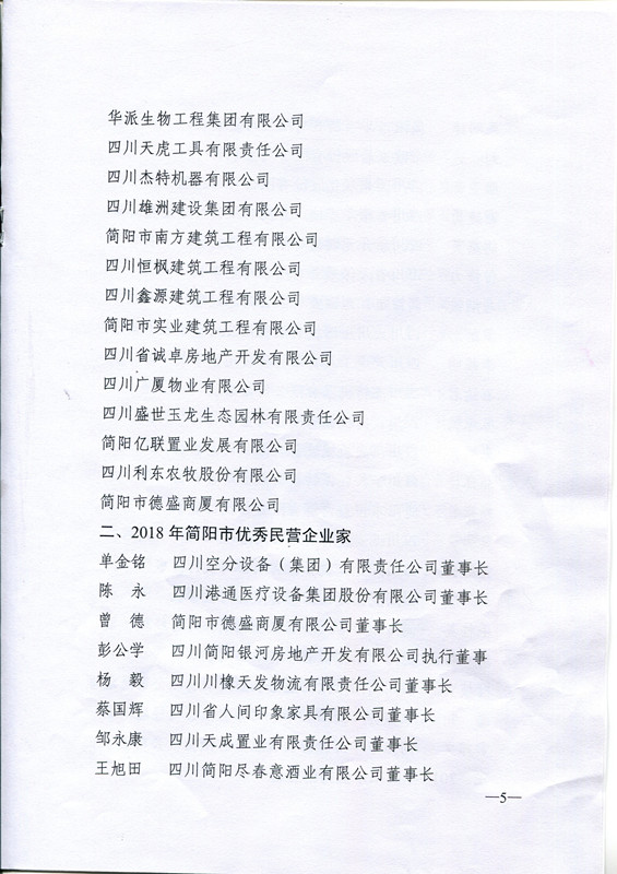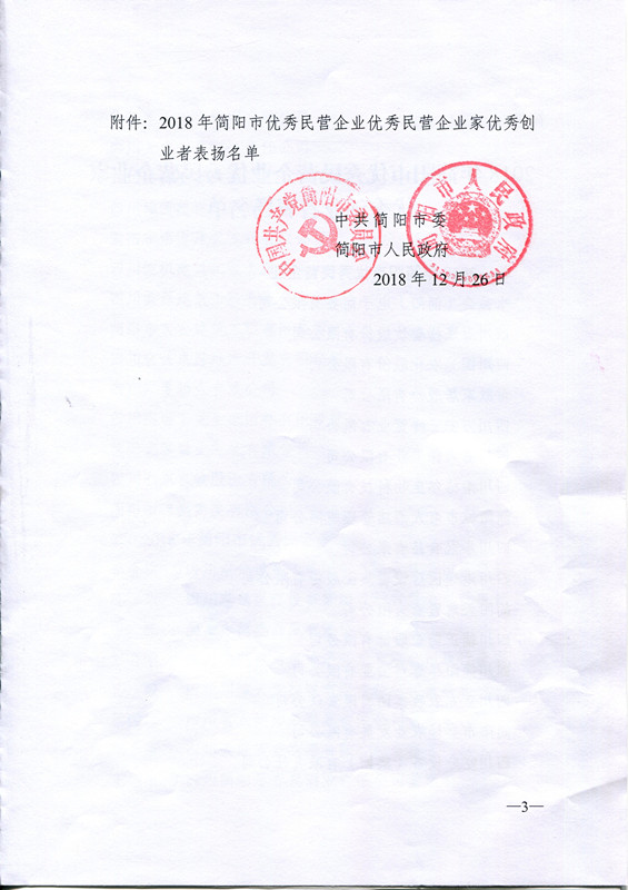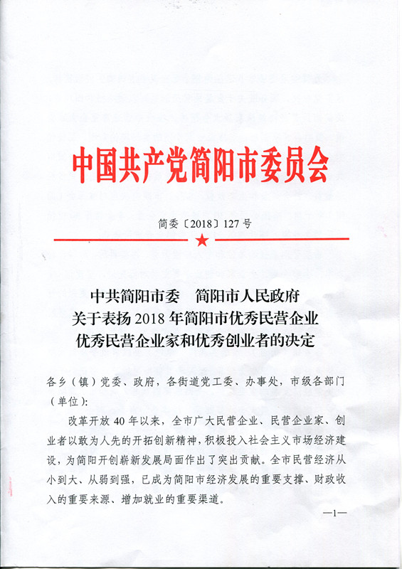 獲得2018年簡陽市優(yōu)秀民營企業(yè)